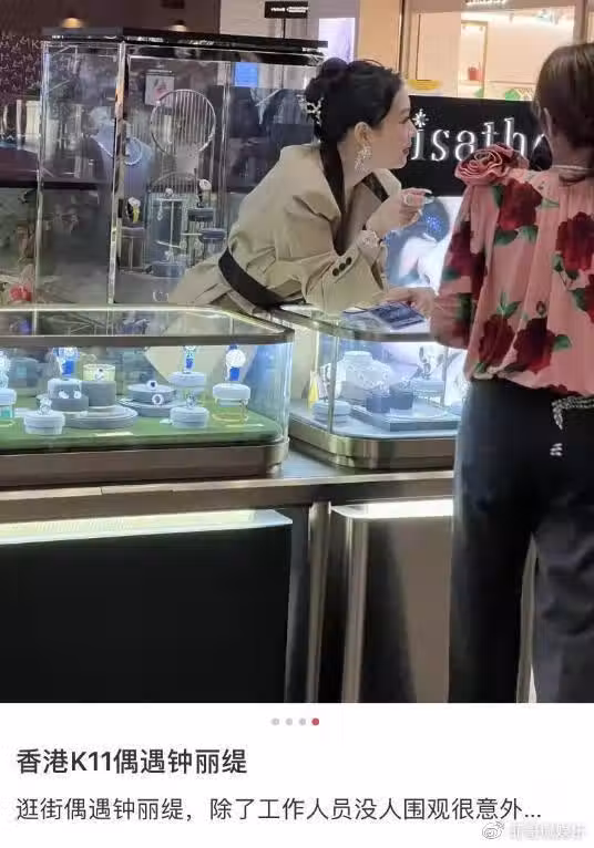網上流傳著一段香港知名購物中心的視頻,女神鍾麗緹身穿卡其色西裝裙,全身佩戴著奢華珠寶為某珠寶品牌站台。 儘管現場觀眾不多,鍾麗緹依舊賣力地凹造型,展現了自己敬業認真的態度。