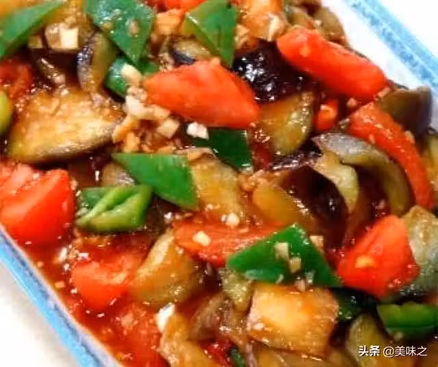 圓茄子500克、西紅柿250克、青椒100克、大蒜20克、鹽2克、白糖15克、醬油20克、黃酒5克、雞精2克、白鬍椒粉少許、蔥花15克、薑末10克、水澱粉適量、烹調油適量。