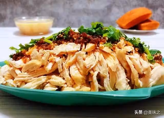 7、需要耐心的把雞胸脯肉撕成絲,撕好的雞胸脯肉擺入盤中。