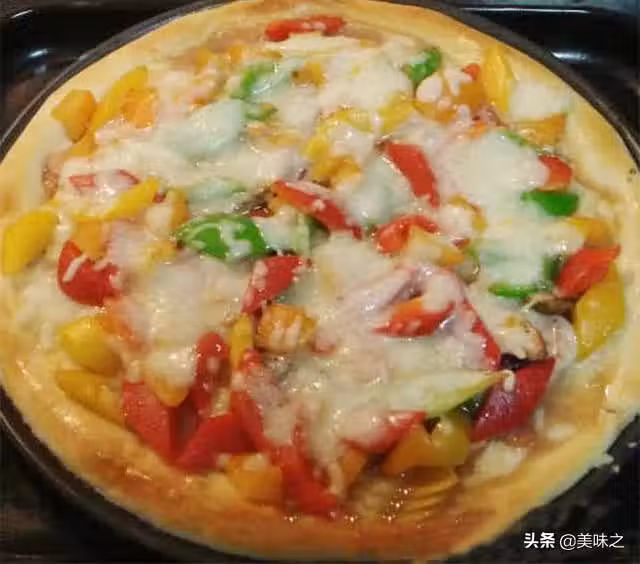 14、再把蔬菜撒在上面,把剩餘的馬蘇里拉奶酪撒在上面,放進烤箱的中上架烤5分鐘。