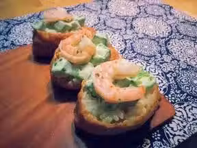 將拌好的秋葵舖在壽司上,最上面再放上蝦仁即可。