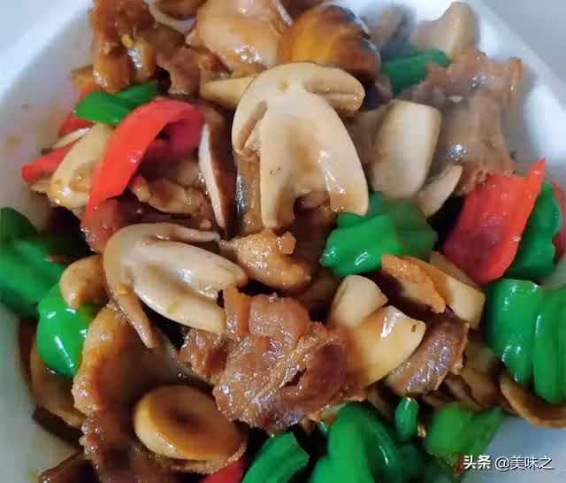 野生鮮松茸半斤、五花肉適量、青椒適量、紅椒適量、大蒜適量、姜適量、鹽適量、生抽適量、雞精適量、蚝油適量。