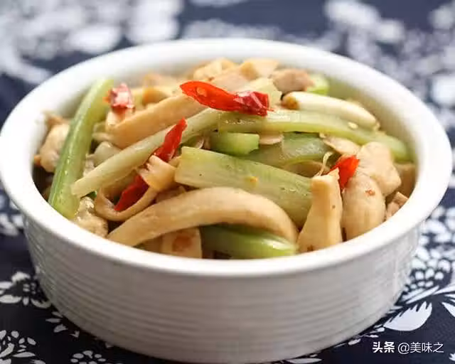 7、再加入蒜和紅辣椒絲, 翻炒均勻,再加入焯過水的西芹絲;