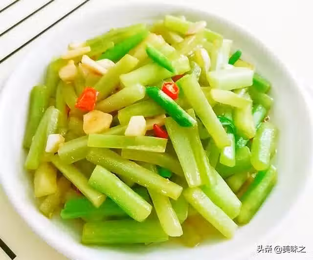 嫩萵筍適量、大蒜頭適量、米椒適量、蒜苗適量、油適量、雞精適量、蚝油適量。