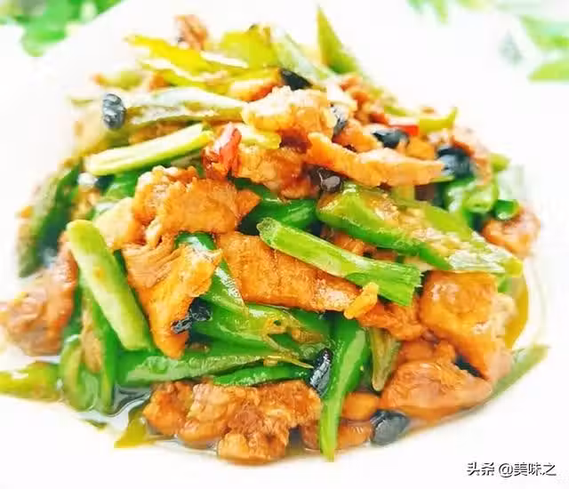 豬肉適量、青椒適量、紅辣椒一個、姜適量、豆豉適量、大蒜頭適量、澱粉適量、米酒適量、油適量、雞精適量、蚝油適量、生抽適量。