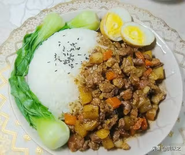 10、米飯盛入碗中,扣在盤中,滷雞蛋切開放入盤中,小白菜焯水後放入盤中,澆上燉好的滷肉,米飯點綴上黑芝麻即可!