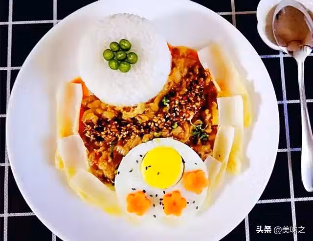 7、米飯提前燜好,米飯盛入碗中,壓實,倒扣過來,放入盤中,澆上老壇酸菜肉鹵,煎好一個雞蛋放入盤中,喜歡放些辣子,吃起來又香又過癮!