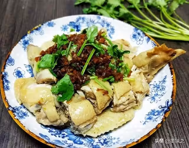 9、將雞肉斬塊,淋上蔥油,撒上香菜,完成。