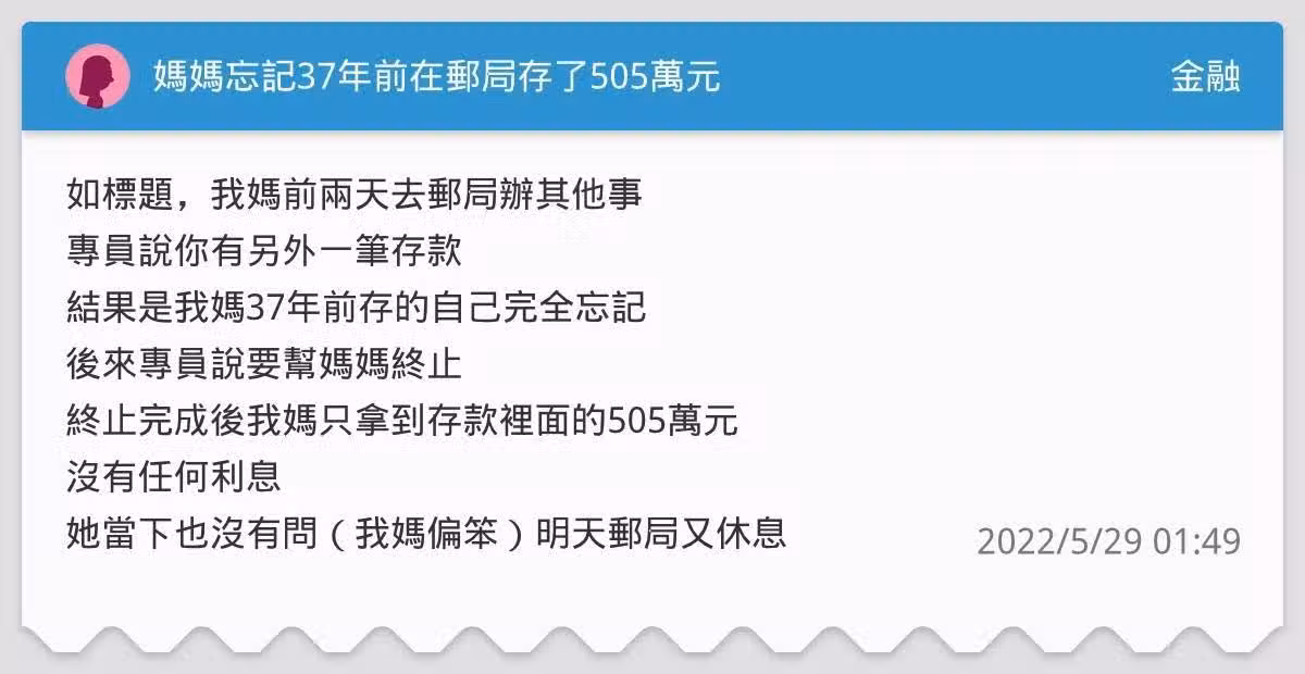 郵局存505萬!天兵媽放37年才想到「領出總金額傻眼」 急求助「這樣正常嗎」網點破盲點:沒錯啊!