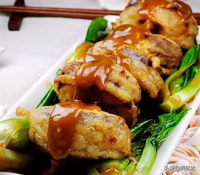 9、加入幾顆小油菜翻拌均勻,將糖醋汁澆到炸好的茄盒上即可。