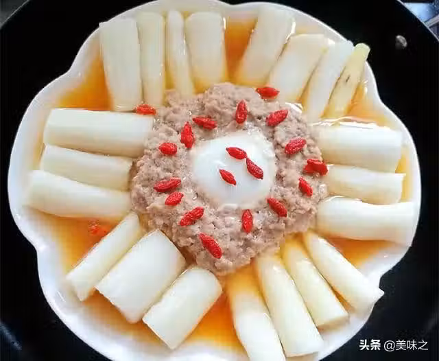 鐵棍山藥3根、肉末250g、土雞蛋1個、東古醬油1匙、蚝油1匙、鮑汁1匙、紅枸杞適量。