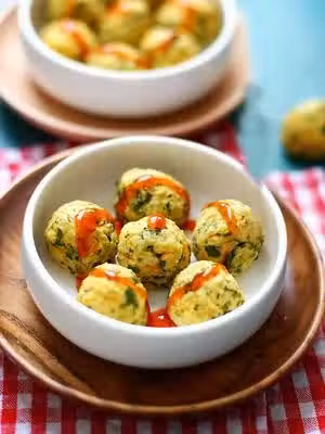 5.戴上一次性手套,取適量的土豆泥混合物團成丸子的形狀,均勻的碼放在烤盤之中。