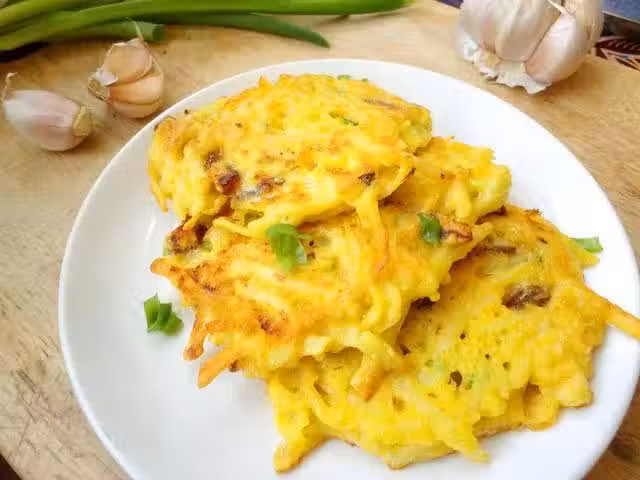 6、出鍋後的土豆絲雞蛋餅可切成小塊食用