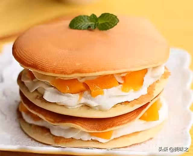 8、放幾粒芒果粒,再擠一層奶油,蓋上一片銅鑼燒,再重複來一層。
