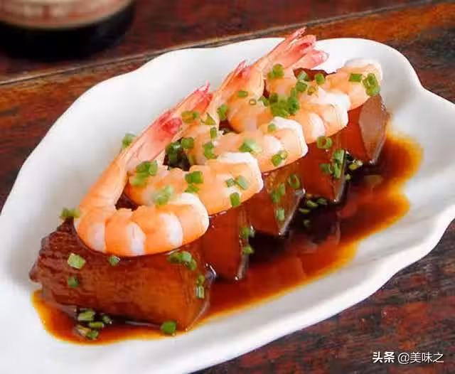 7、煮好的冬瓜先盛盤,再把蝦仁擺放在冬瓜上,撒上適量蔥花增香增色即可。