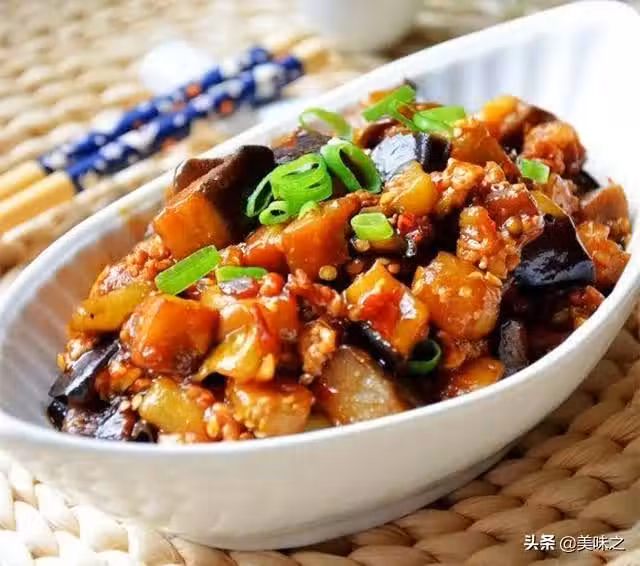10、淋入少許水澱粉,茄子翻炒均勻關火,盛入盤中再撒蔥花即可。