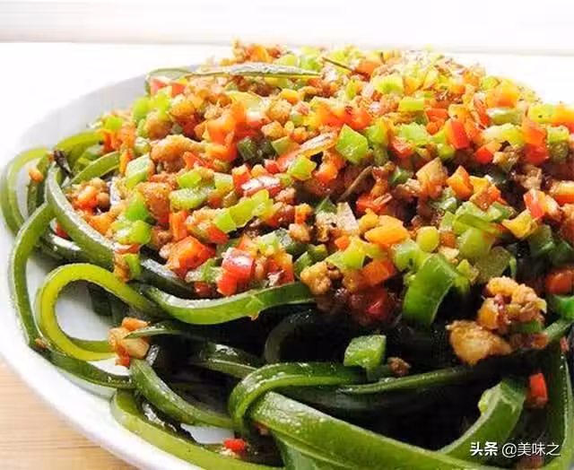 海帶300g、肉末100g、青椒1個、紅尖椒1個、蔥適量、姜適量、蒜適量、醬油適量、料酒適量、糖適量、鹽適量。