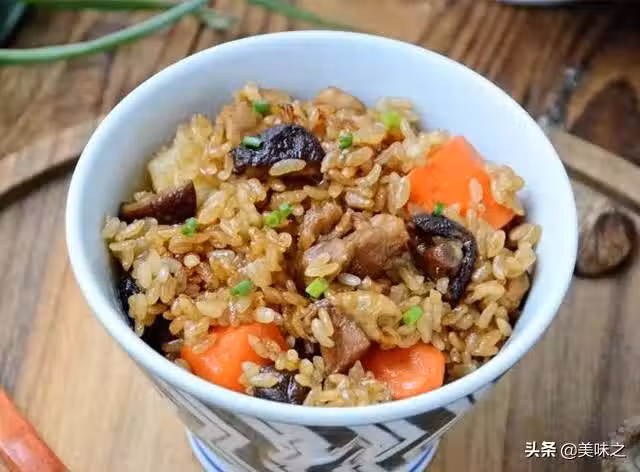 雞腿1個、胡蘿蔔1根、干香菇10克、土豆1個、大米150克、蔥1根、生薑1片、生抽1湯匙、老抽1湯匙、料酒2湯匙、鹽4克、冰糖5克。