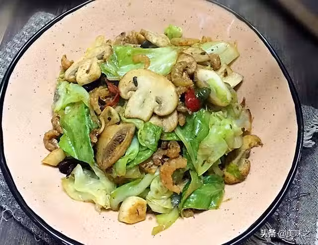 包菜150克、海米25克、口蘑4個、油適量、鹽適量、豆豉適量、大蒜2瓣、辣椒半個。