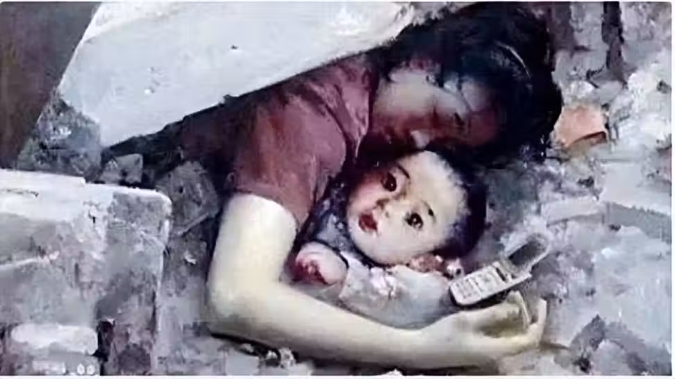 The earthquake in 2008 caused thousands of happy families to be shattered in an instant, and people were separated forever. When search and rescue personnel lifted the rocks that were weighing on her, they found that she had been dead for a long time. She bent her body under the rocks to protect the infant child unscathed.