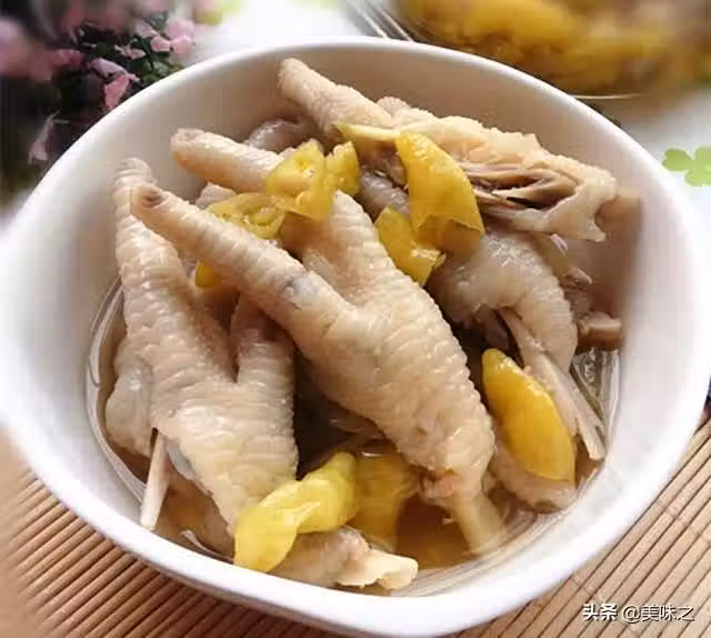 雞腳500克、泡椒適量、生薑適量、花椒適量、桂皮1小塊、八角2個、香葉1片、鹽適量、白糖2小勺、黃酒適量、香糟鹵適量、白醋適量。