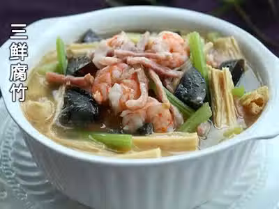 材料:腐竹,鮮蝦,皮蛋,培根,芹菜,薑蔥 蒜