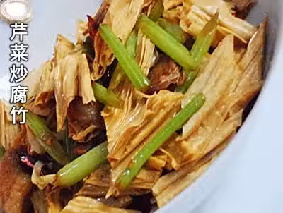 材料: 芹 菜 200 克,腐竹 200 克,豬肉 適量,蒜 適量,辣椒 適 量