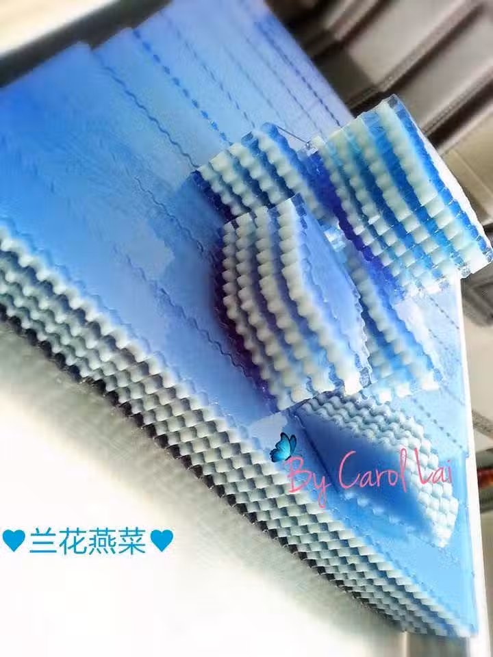 2) 放一層A,等到差不多凝固了就用叉子弄多多個洞空,以妨止燕菜層脫落,然後放一層 B