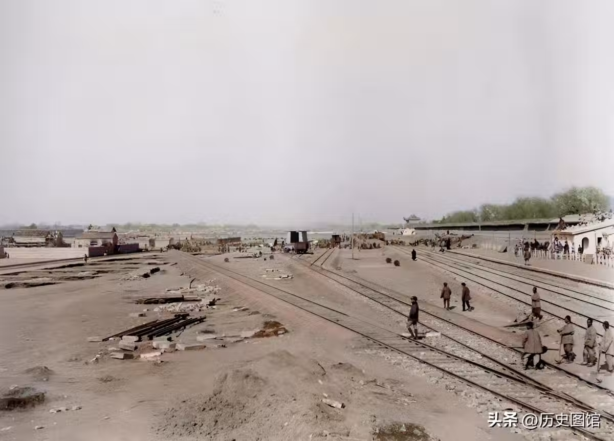 這是位於北京天壇附近的一個火車站。它是北京城內第一座近代化火車站。數條鐵軌延伸向遠方,幾名鐵道工人正在路基上施工。遠處的站台上,也有不少人在候車。