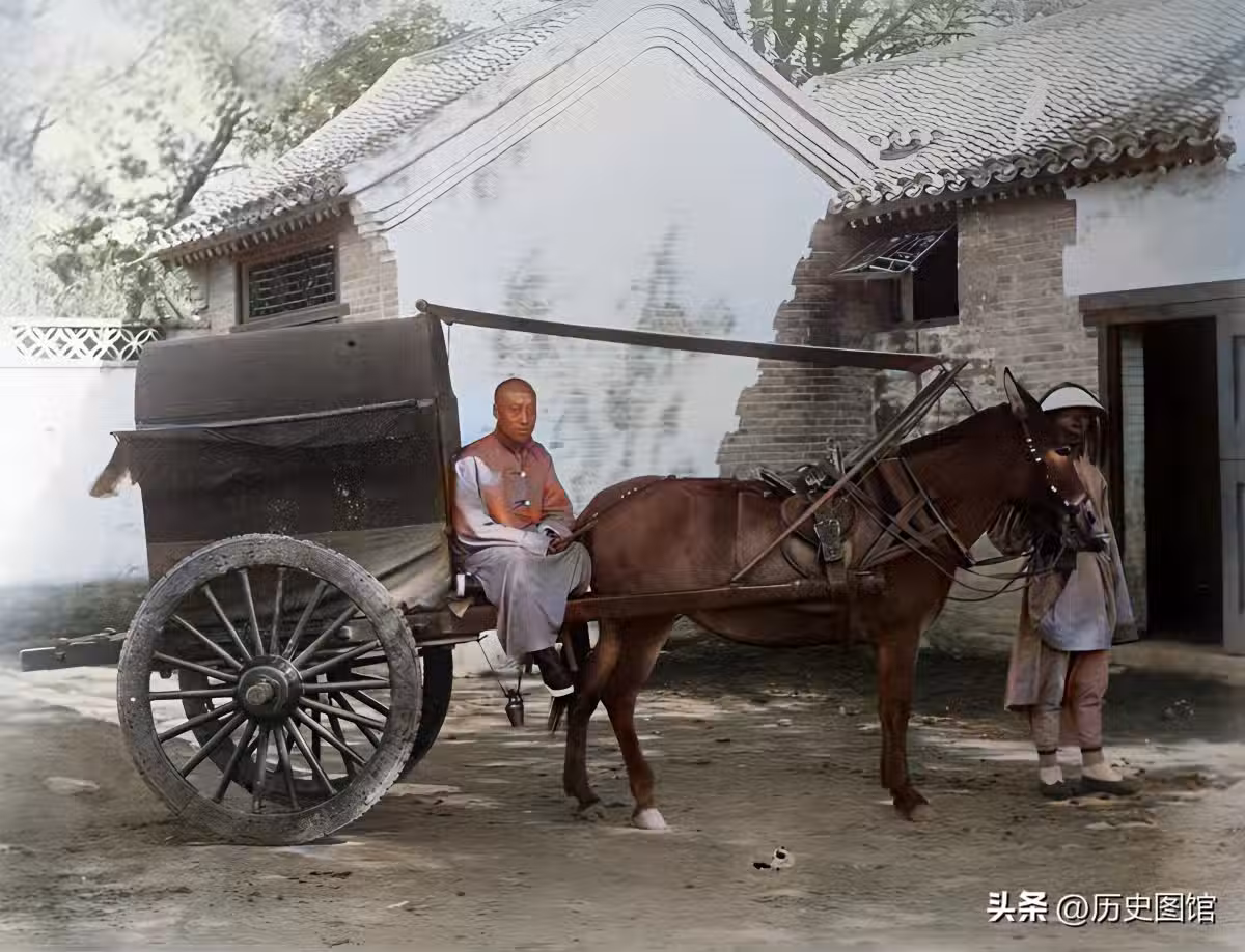 一名官員出行前,官差和車夫已經將馬車準備好。這種馬車帶有涼棚,能夠遮風擋雨。從照片的背景看,應該是拍攝於一個衙門的馬廄前。馬車是當時主要的交通工具。