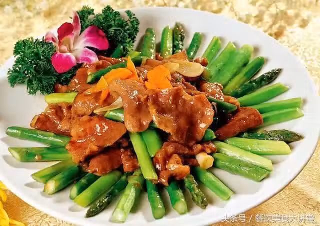 1.將蘆筍切去老根洗凈,馬蹄切片,鍋中放水燒開加少許油和鹽,放入蘆筍和馬蹄一起水裡略煮,倒出過冷水備用;豬肉切片
