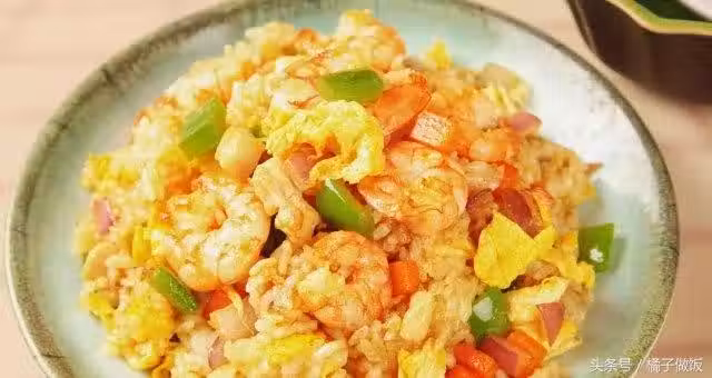 11 倒入炒過的蝦仁和雞丁,炒勻,放入冷米飯,炒散。