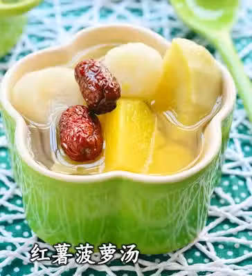 材料:菠蘿半個, 紅薯1個, 荸薺28個, 紅棗6粒,冰糖適量