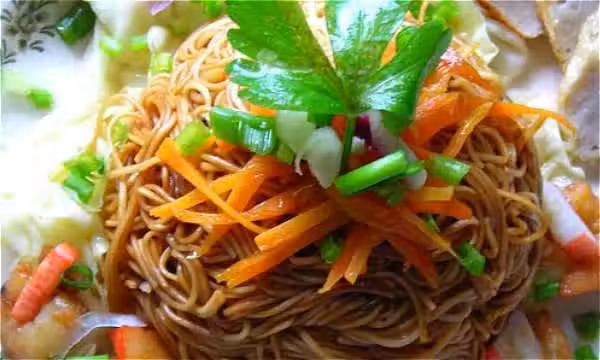 煮開面,過冷水,再燙一下。用調味料全部拌勻。熱鍋,爆香蒜碎,加入紅蘿蔔、包菜稍微炒勻,再加入魚片和蝦,加點生抽和胡椒粉即可。將炒好的食料倒在面上即可食用。
