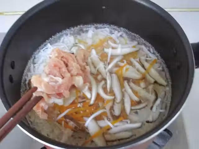 依次把香菇,胡蘿蔔絲,豬肉絲加入,用筷子輕輕攪散