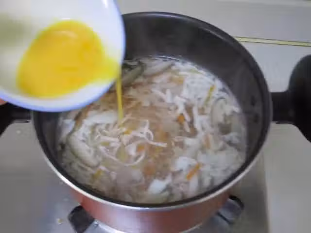 先熄火,把蛋液慢慢的繞圈倒入,這一步很關鍵,利用鍋內的溫度倒入的的蛋液才能出蛋花狀