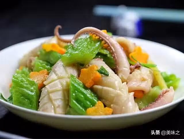 7、再加入焯過水的魷魚和苦瓜塊翻炒兩下;
