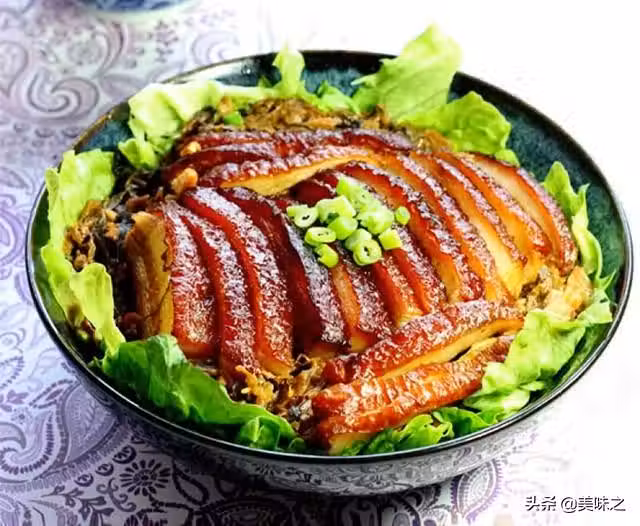 16、將炒好的梅乾菜碼在五花肉的上面和旁邊,放入鍋中蒸1小時。蒸完後倒扣在另一個碗中。