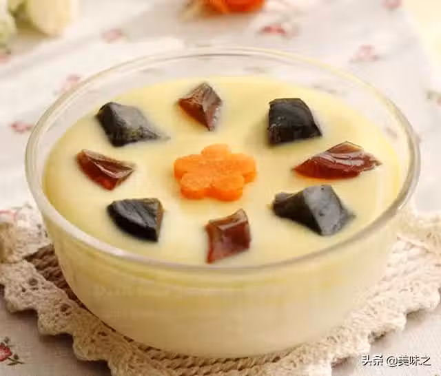 嫩豆腐1盒、雞蛋3個、鹹鴨蛋1個、皮蛋1個、芝麻油適量、雞精適量、小蔥適量。