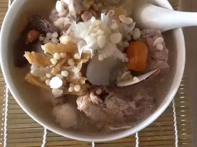材料:南北杏30g、川貝5g、陳皮10g、海底椰20g、銀耳20g、蜜棗30g、豬肉500g