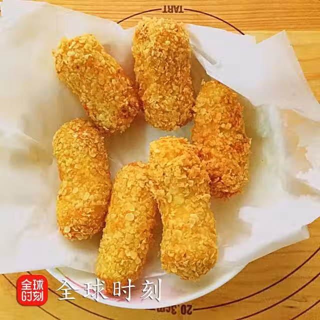 4、把粘好燕麥香蕉放入板上,先靜置一會兒,炸的時燕麥才不會容易掉