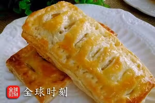 8、鬆弛好的派上皮塗上蛋液,烤箱180度,中層,20—25分鐘,餅皮上色,分層明顯即可