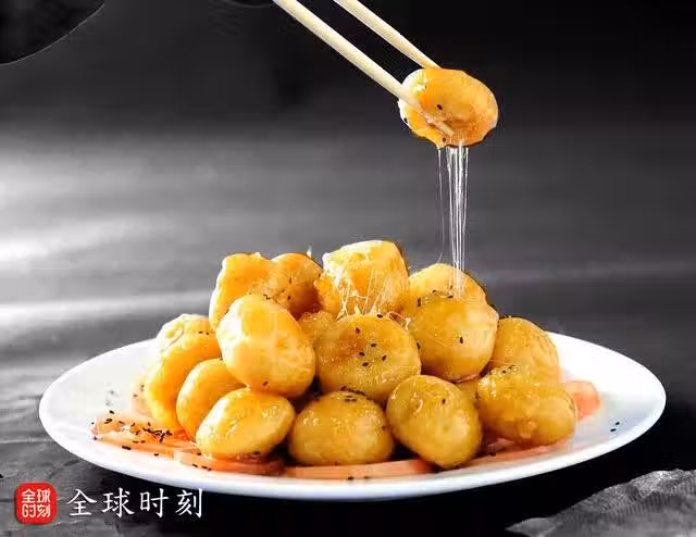 為使得香蕉外皮更脆,也可復炸一遍。略撒黑芝麻可增加香味。