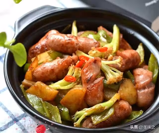 1、菜花、土豆、尖椒洗凈,香腸準備好。