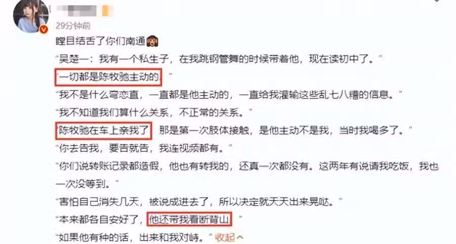 並且對吳楚一的孩子出生時間表示懷疑,認為是他未成年時生下的。他跟陳牧馳應該差不多大,怎麼孩子就已經上國中了?