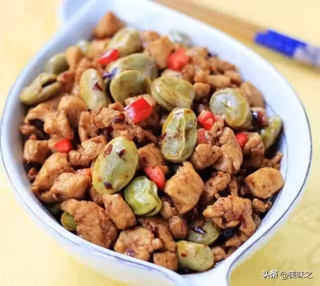 新鮮蠶豆200g、雞腿肉200g、植物油10茶勺、鹽4g、姜2g、頭道醬油10g、澱粉1茶勺、料酒1茶勺、胡椒粉2g、老乾媽2大勺。
