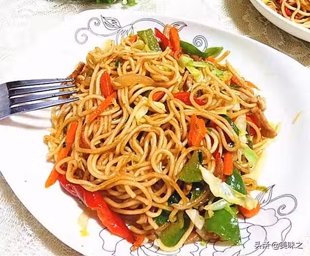 麵條150克、肉絲適量、青椒半個、紅椒半個、洋蔥適量、胡蘿蔔半根、圓白菜適量、生薑絲適量、香蔥2根、鹽適量、生抽2小勺、老抽1小勺、黃酒適量。