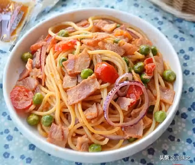 意粉適量、培根適量、沙拉醬適量、豌豆適量、洋蔥適量、小番茄適量。