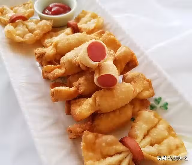 餛飩皮16張、台式小烤腸兩袋、火腿腸四片、清水少量、食用油少量。