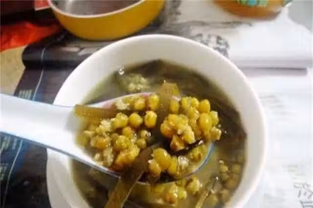 1.綠豆洗凈後用清水泡2個小時。海帶泡發。